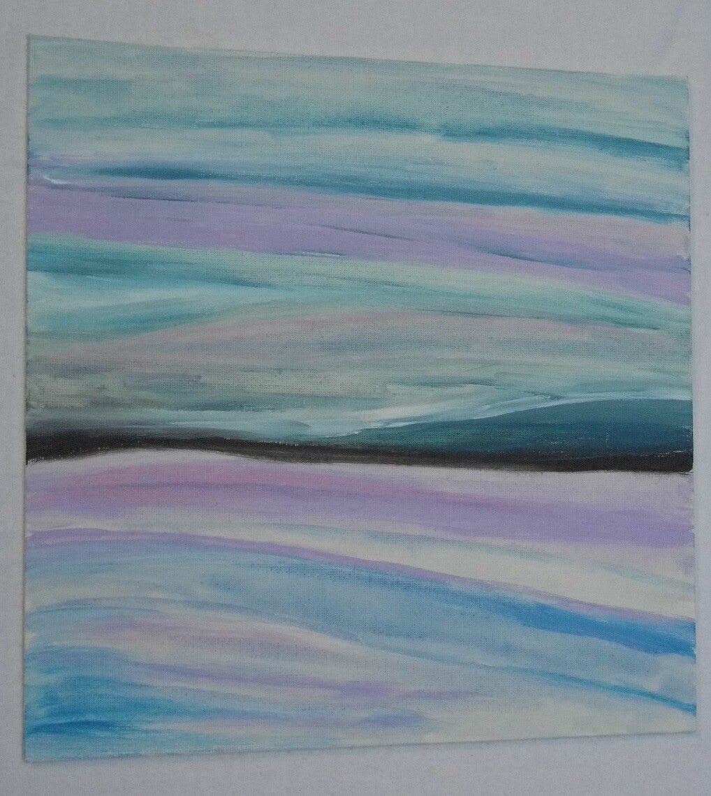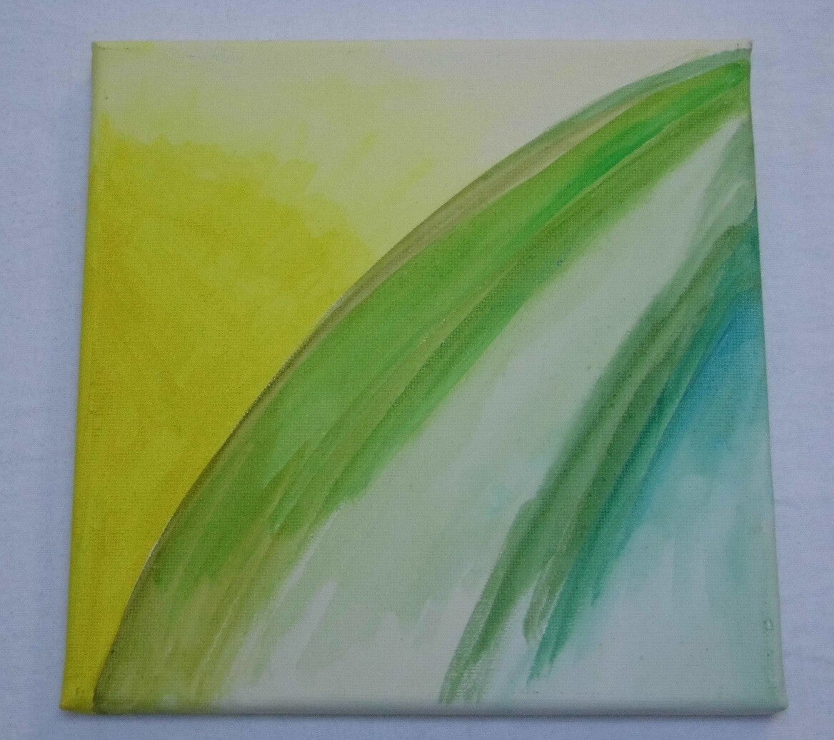 Het creatieproces verloopt bijna altijd als volgt: net als bij een sound healing geef ik mijn intuïtie vrij spel. Ik neem een of twee kleuren verf en zwart en wit. In het begin meng ik ze meestal op het palet en werk ik voorzichtig, maar op een bepaald moment komt er een stroomversnelling. Dan gaat het snel zodat mijn denkgeest geen kans meer krijgt om er wat van te vinden. Dan begin ik kleuren op het doek te mengen en in elkaar te laten overvloeien; heerlijk vind ik het bijvoorbeeld om een penseel dat nog halfvol verf hangt in een andere kleur of in water te dopen en te zien wat er gebeurt. Of ineens een andere kleur erbij te nemen. Het flowt, er bestaat niks anders meer en nadat dat mijn thee koud geworden is, komt er een moment dat de tijd weer vertraagt. Dan voel ik dat het af is. Als er nog wat verf over is, verzamel ik dat op een nieuw canvasje. Soms wordt dat meteen een heel ander werk, soms is het eentje om een volgende keer mee verder te doen. 's Morgens ben ik heel benieuwd hoe het geheel eruit ziet want in ochtendlicht zijn de opgedroogde kleuren anders.